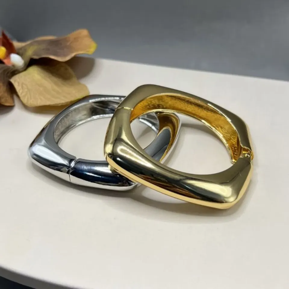 Bracelete quadrado liso brilhante, abertura na lateral. Os braceletes grossos são acessórios que podem ser uma peça marcante e versátil, complementando looks casuais ou formais. Eles podem ser uma adição luxuosa à coleção de acessórios. Eles aparecem lisos, coloridos e com detalhes em pedras.