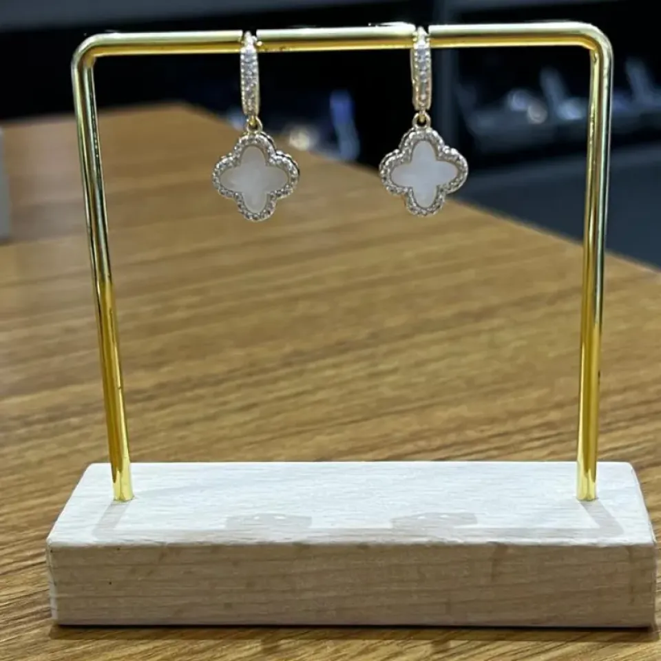 Brinco argola clik inspiração - madre pérola banhado a ouro. Argolinha cravejada em zircônias com 10mm de diâmetro + pingente de trevo em pedra sintética com 10mm.
