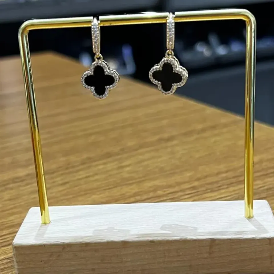 Brinco argola clik inspiração - Preto, banhado a ouro. Argolinha cravejada em zircônias com 10mm de diâmetro + pingente de trevo em pedra sintética com 10mm.