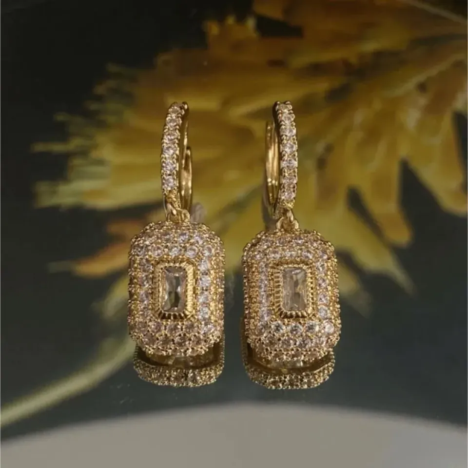 Este brinco banhado a ouro é cuidadosamente cravejado com micro zircônias brilhantes, que realçam seu design glamouroso e atemporal. A pedra central em formato retangular traz destaque e elegância, tornando-o perfeito para ocasiões especiais ou para transformar qualquer look do dia a dia.