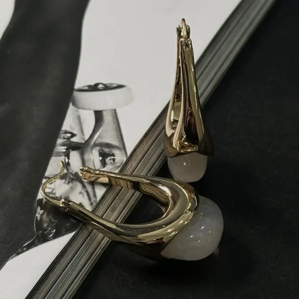 Com um design moderno e escultural, este brinco é pura sofisticação. A estrutura em metal dourado polido envolve delicadamente uma pedra branca leitosa, criando um contraste suave e elegante. Um acessório marcante que transmite personalidade e refinamento em cada detalhe.