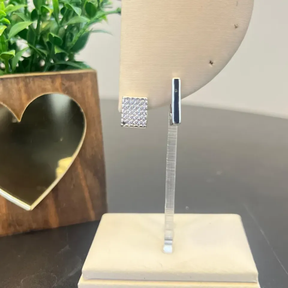 Brinco de Clik duplo banhado a ouro , uma quadrado cravejado em micro zircônias 5x7mm e outro quadrado liso com 3x11mm.