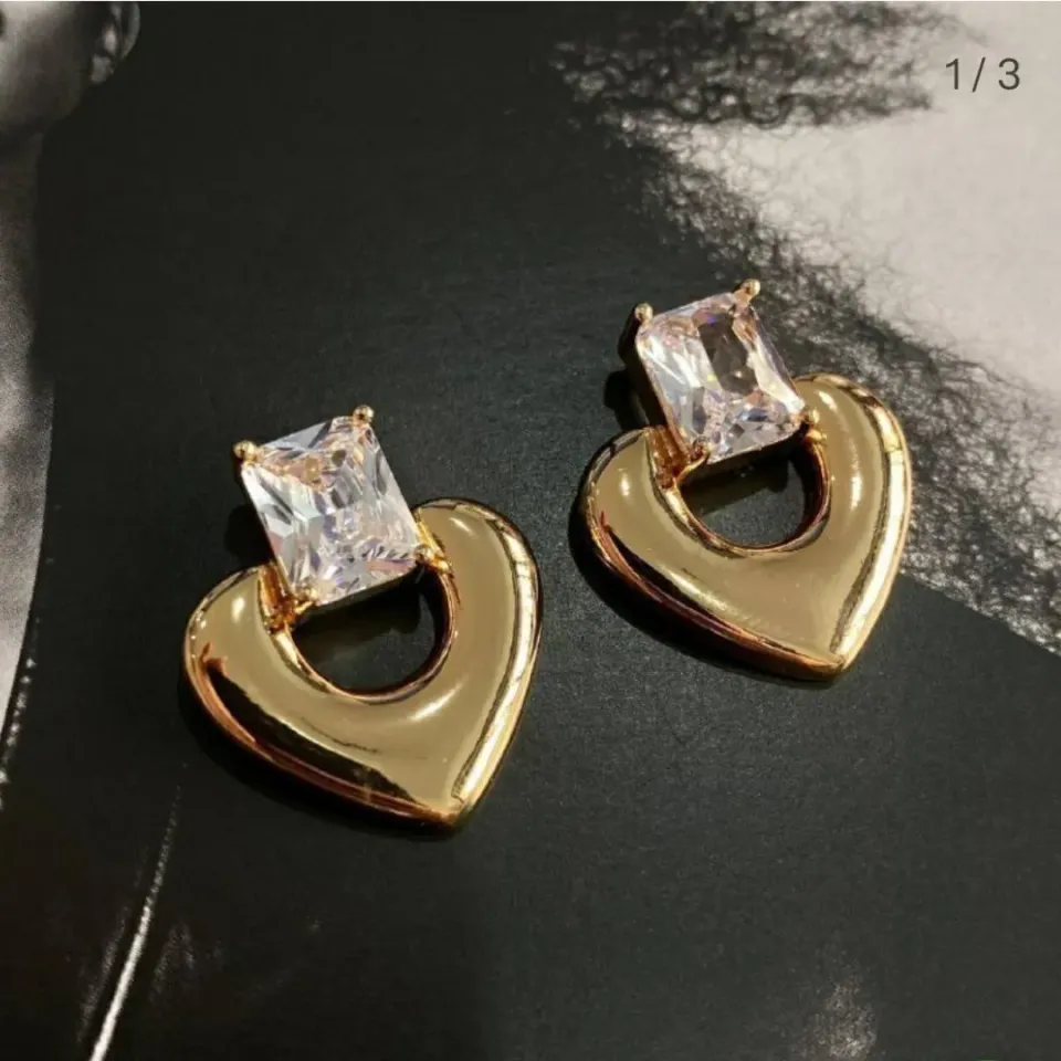 Brinco banhado a ouro com Pedra retangular de zircônia e coração liso, no tamanho total de 25mm de altura x 20mm de largura, com tarraxa.