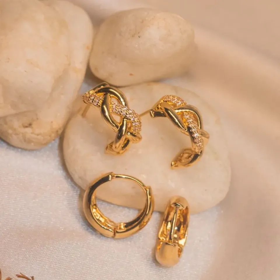 Elegância em dose dupla! Essa combinação traz a sofisticação do design clássico aliado ao brilho moderno do banho em ouro. Versáteis e cheios de estilo, os brincos podem ser usados juntos para um look marcante ou separadamente para composições delicadas. Uma escolha perfeita para quem busca praticidade sem abrir mão do luxo.