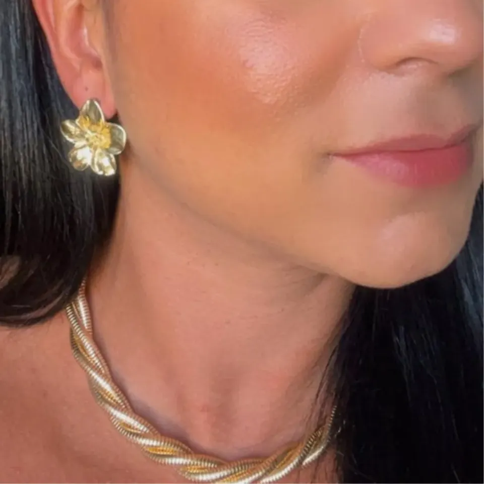 Brinco de Flor banhado a ouro com 30mm de diâmetro, fechamento em tarraxa.