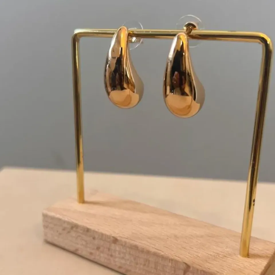 Brinco banhado a ouro de gota Oca com 30mm de comprimento7mm de largura na ponta, liso fechamento em tarraxa.