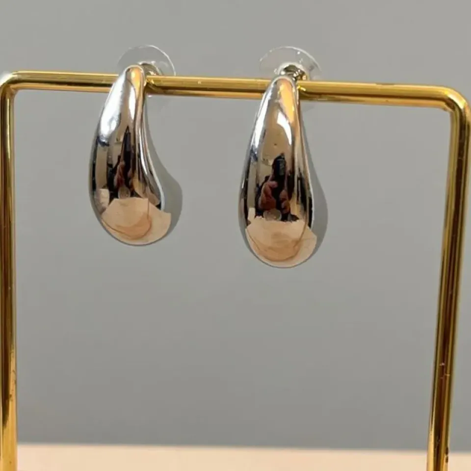 Brinco banhado a Rodio de gota Oca com 30mm de comprimento7mm de largura na ponta, liso fechamento em tarraxa.