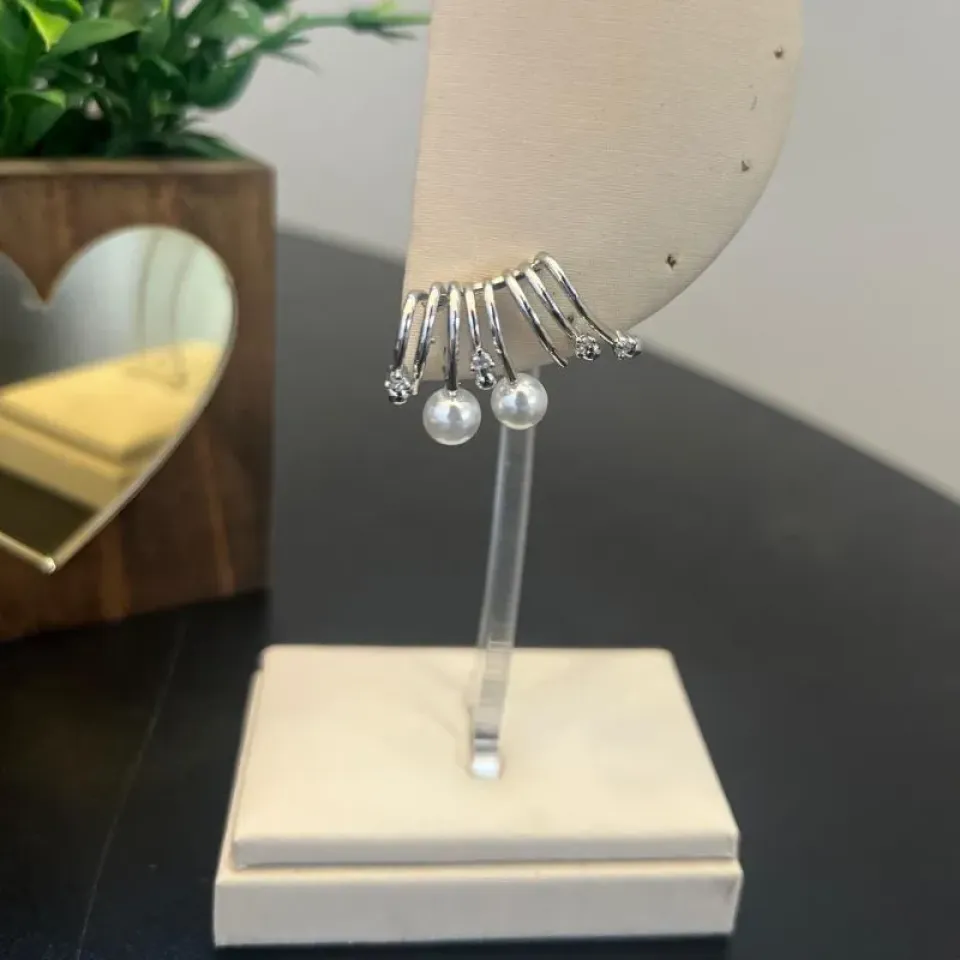 Brincos que traduzem elegância com um toque moderno. As curvas delicadas, as pérolas clássicas e o brilho das pedras criam uma peça única que valoriza qualquer visual. Disponível nas versões dourada e prateada. Qual combina mais com você?