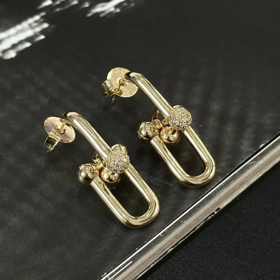 Brinco Inspiração Cartier HARDWEAR, banhado a ouro com 35mm de comprimento bolinha cravejada, fechamento em tarraxa.