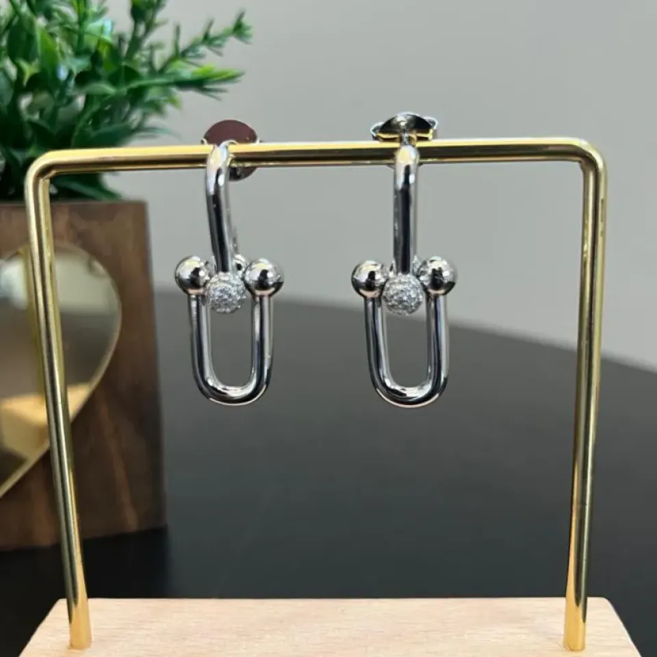 Brinco Inspiração Cartier HARDWEAR, banhado a Ródio com 35mm de comprimento bolinha cravejada, fechamento em tarraxa.