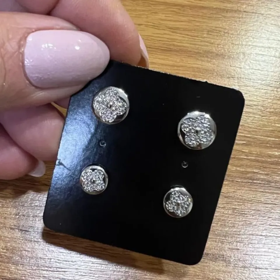 Brinco duplo inspiração Van Cleef, banhado a Ródio branco, redondo cravejado em micro zircônias com 5/10mm de diâmetro, fechamento em tarraxa.