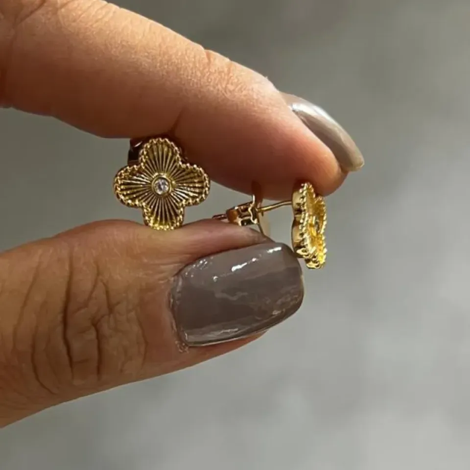 Brinco Trevo Inspiração, banhado a ouro com 10mm de diâmetro uma zirconia no meio e tarraxa.