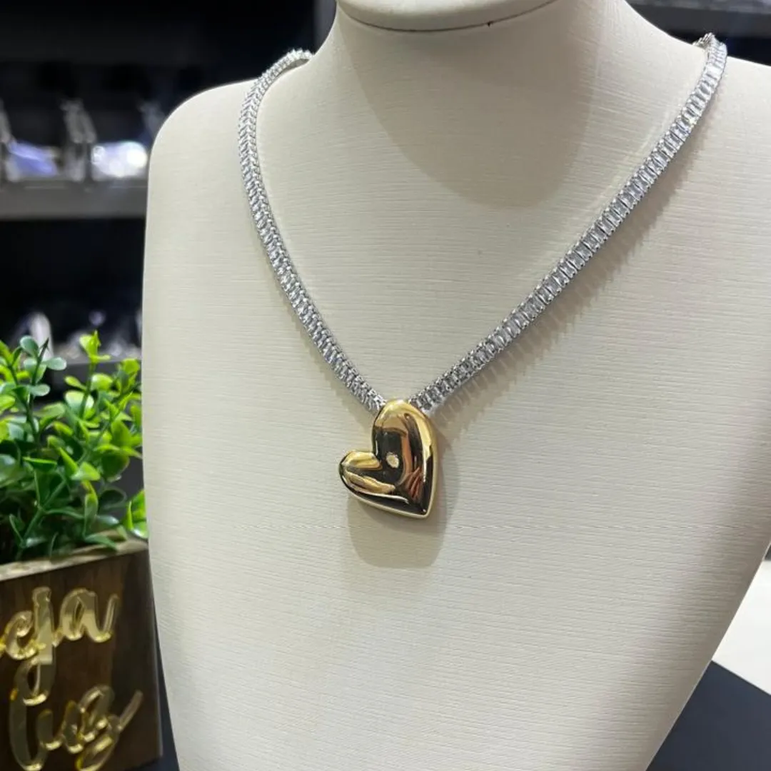 Choker Riviera com pingente de coração - Ródio e Dourado. Choker com 40cm de comprimento + 10cm de extensor, pedras retangulares com 5mm de largura banhada a ródio , pingente removível de coração liso banhado a ouro com 30mm.
