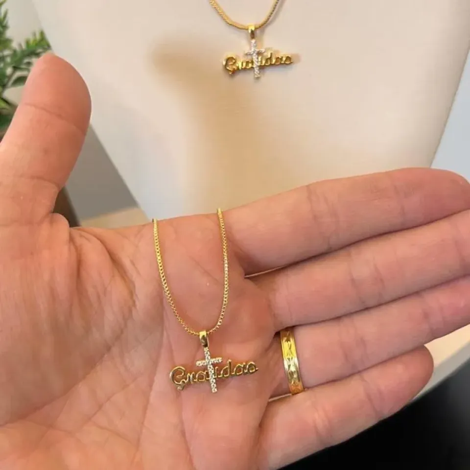Corrente veneziana com 40cm de comprimento + 5cm de extensor, fecho lagosta. Banhada a ouro com pingente escrito Gratidão, com o T em forma de cruz cravejada em zircônias.