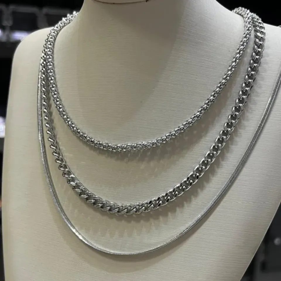 Colar Trio - Banhado a Rodio com corrente Sneake com 50cm de comprimento + 6cm de comprimento e 3mm de espessura, corrente grumet com 7mm de espessura 40cm de comprimento + 5cm de extensor e fio pipoca com 35cm de comprimento + 5cm de extensor e 3mm de espessura.