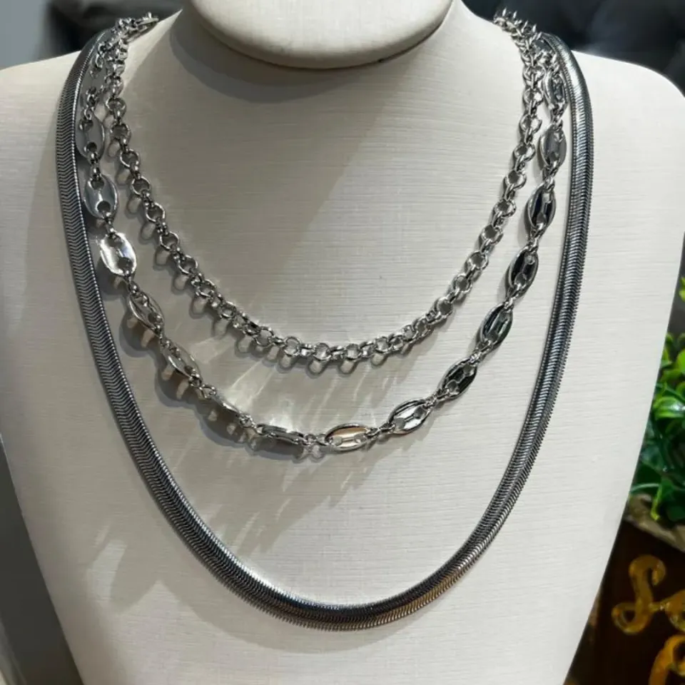 Colar triplo com Colar Skeaker de 50cm de comprimento + 5cm de extensor e 5mm de largura, Choker lacre com 45cm de comprimento + 5cm de extensor e 8mm de largura Choker elo português com 40cm de comprimento + 5cm de extensor e 4mm de largura. Banhado a Rodio com garantia.