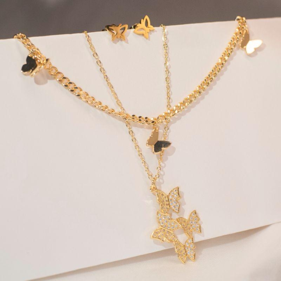 Conjunto de Aço com Banho de Ouro - Corrente Dupla sendo uma de elos Grume com pingentes de borboleta com10mm e uma elos finos com pingente de borboleta cravejada com 30mm, brinco de borboleta lisa com 8mm- Corrente com 40/45cm + 5cm de extensor.