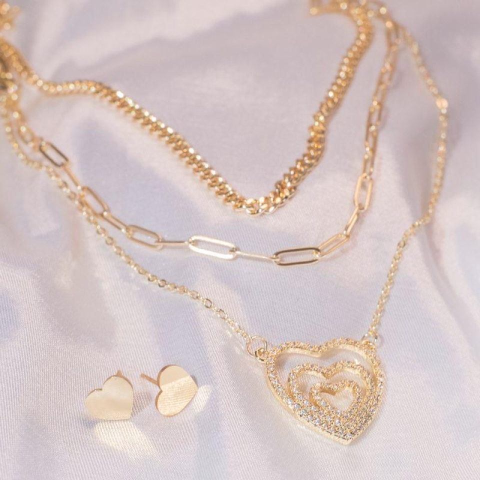 Composto por colares em diferentes texturas e um lindo pingente de corações cravejado, acompanhado de brincos delicados, ele une romantismo e modernidade em uma única produção.