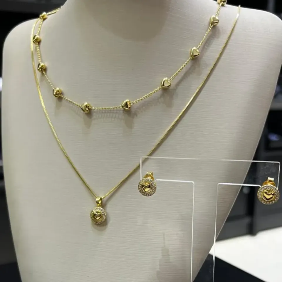Conjunto corrente dupla, com fechamentos separados, sendo uma choker de fio coração com 40cm de comprimento e veneziana com 45cm de comprimento + 6cm de extensor, com pingente redondo cravejado em zircônias e coração liso no meio e brincos redondinho cravejado em zircônias em volta e coração liso no meio com 10mm de tarraxa.
