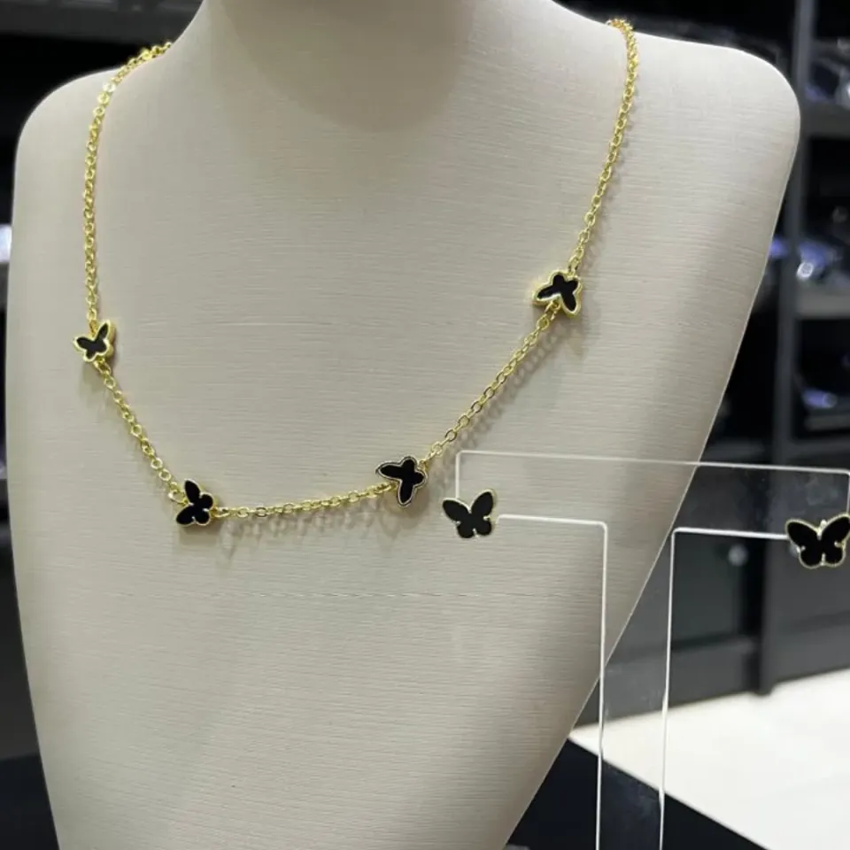 Conjunto banhado a ouro de borboletas com resina preta. Corrente com 45cm de comprimento elos cartier 4 borboletas com 6mm, brinco com 6mm tarraxa.
