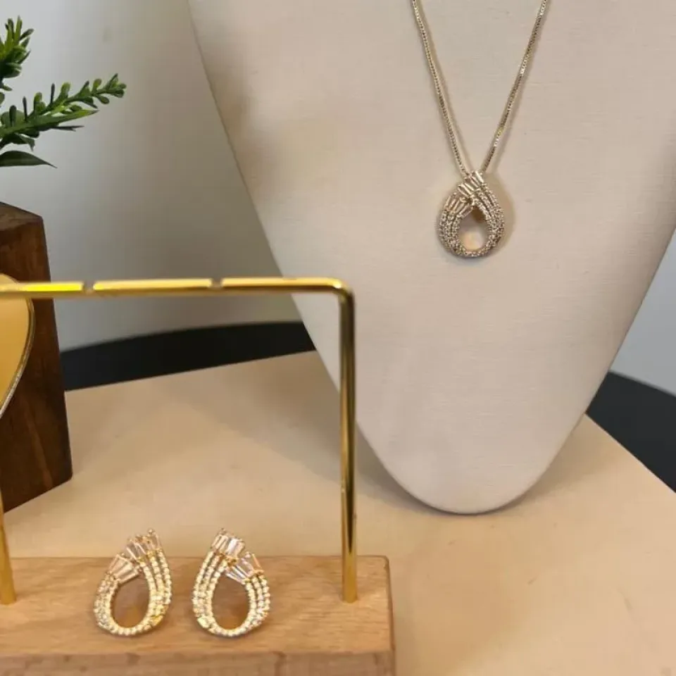 Esse conjunto de brinco e colar em formato de gota combina design moderno com o brilho das zircônias, garantindo sofisticação em qualquer produção. Disponível nas versões dourado e prateado, é a escolha perfeita para quem busca uma peça versátil e marcante, capaz de transformar qualquer look em um visual único."