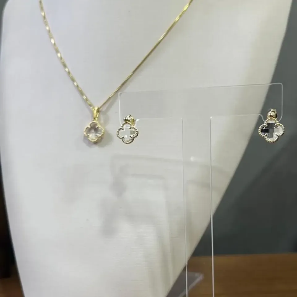 Conjunto Inspiração banhado a ouro com pedra de cristal transparente. Brinco com 10mm, pingente com 15mm, corrente veneziana final com 40cm de comprimento + 7cm de extensor.