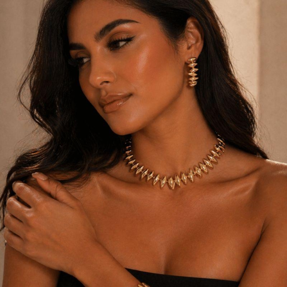 Imponentes na medida certa, o brinco e o colar desse conjunto trazem um design moderno com acabamento polido que reflete a luz de forma elegante. Os detalhes em formato de spikes criam movimento e personalidade, tornando cada peça única e marcante.