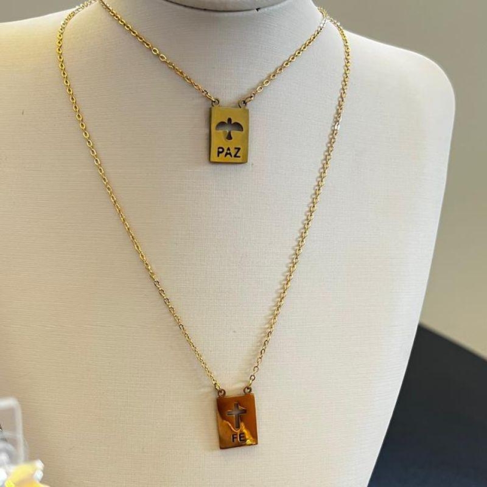 Escapulario em aço com banho de ouro, plaquinhas de Fé e Espirito Santo, para ser usado um de cada lado.
