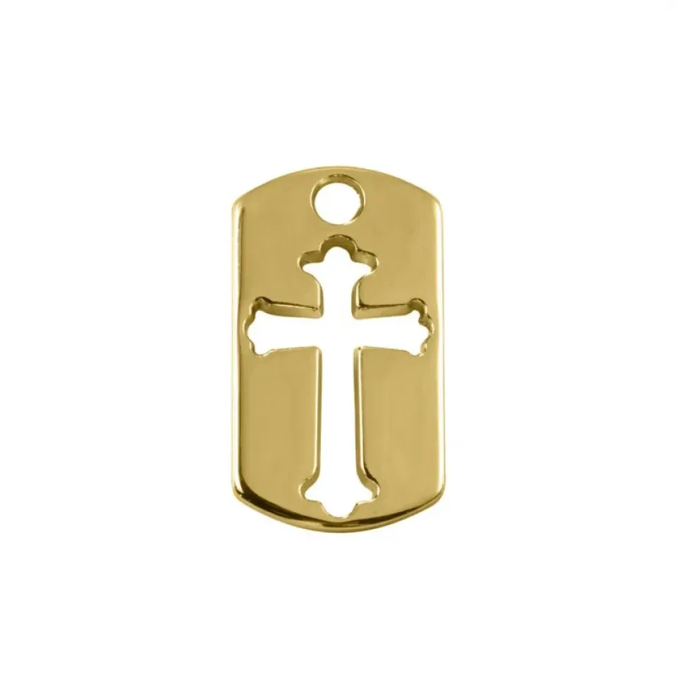 Pingente retangular cruz vazada banhado a ouro com 25mm.