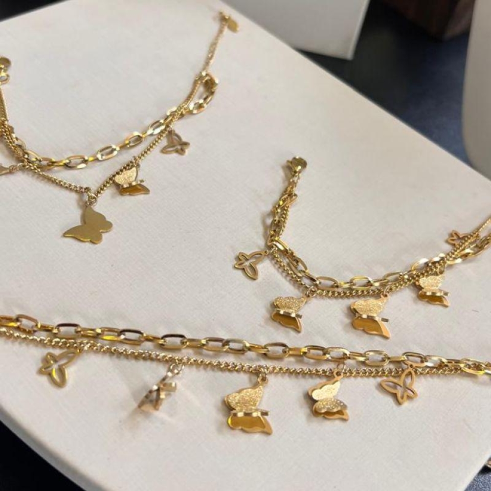 Pulseira em aço inox com banho de ouro, dupla com pingentes de borboleta fosca.As pulseiras transmitem sofisticação e realçam ainda mais a beleza feminina