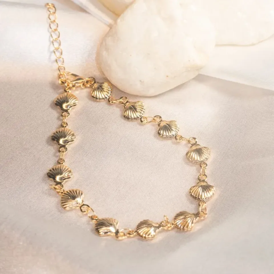 Charmosa e delicada, essa pulseira traz o frescor do estilo praiano com pingentes em formato de conchas douradas. Um acessório que combina leveza e elegância, perfeito para iluminar tanto produções casuais quanto looks mais sofisticados.