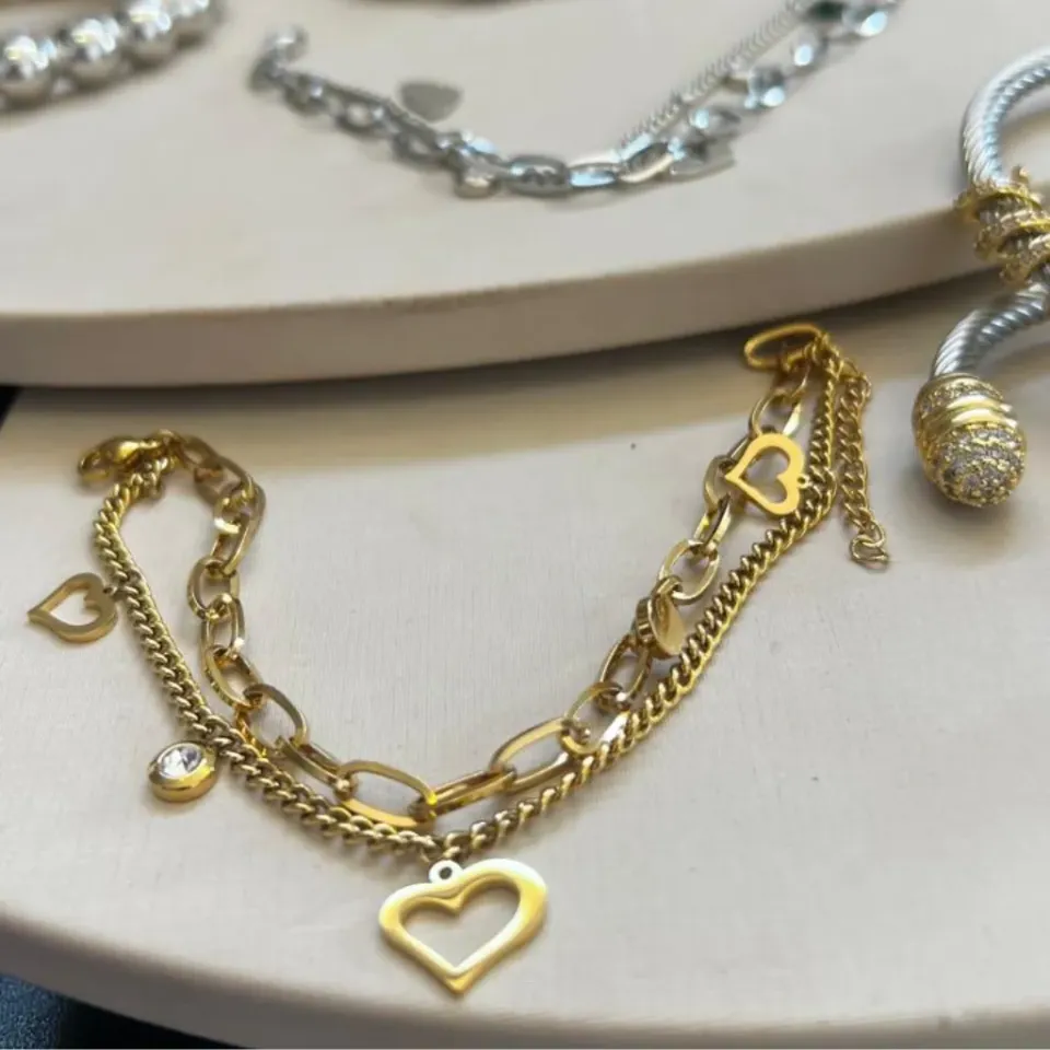 Pulseira em aço inoxidável com banho de ouro. Pulseira dupla com um elo cartier redonda lisa, e uma fio de elo grumet com pingente de coração e ponto de luz.