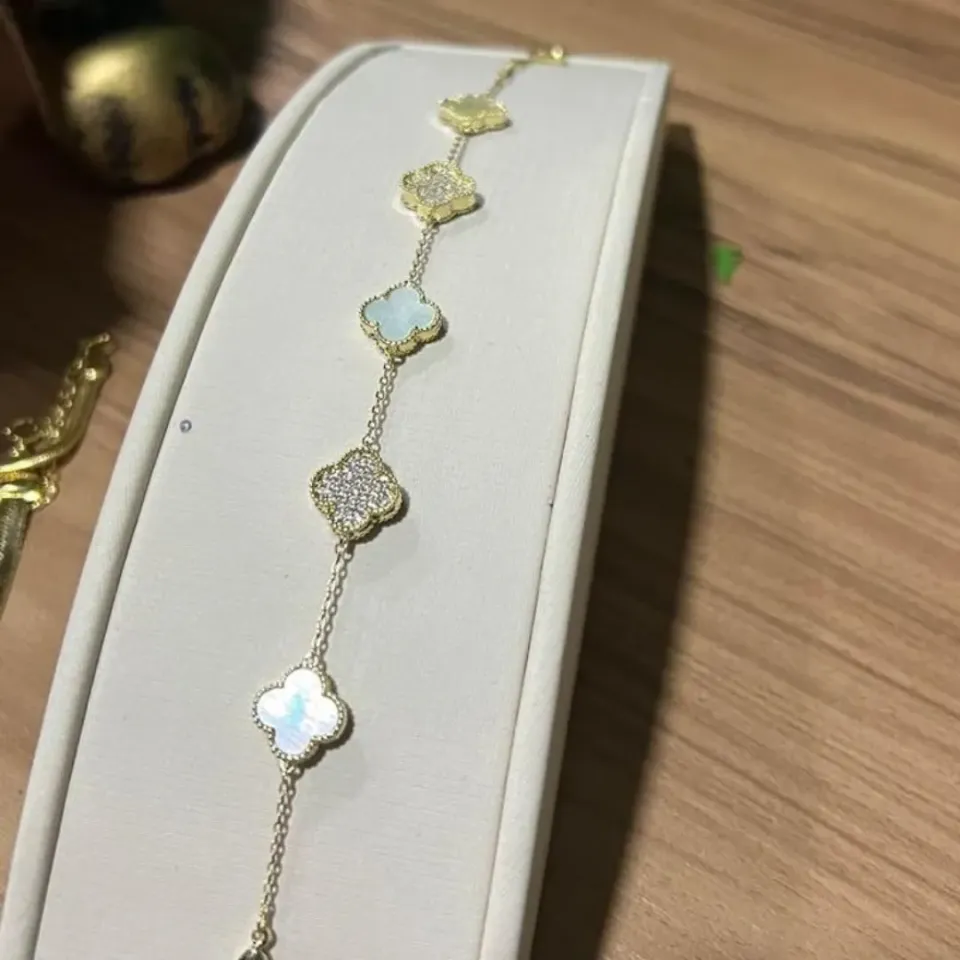 Pulseira banhada a ouro 18, modelo inspiração Van Cleef dupla face com madre perolas e zirconias, 18cm de comprimento com +5cm de extensor trevos com 10mm.