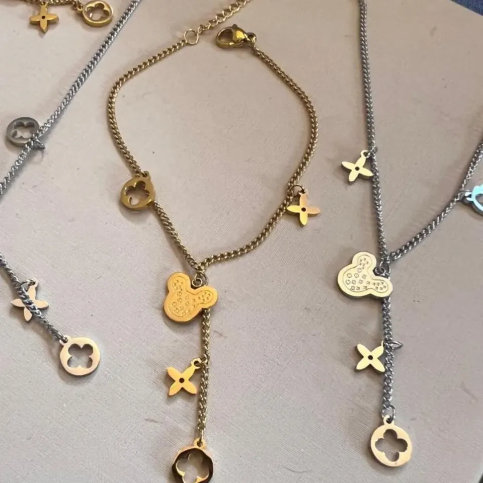 Pulseira de elos finos pingente Michey e trevos em aço com banho, com 18cm +5cm de extensor.