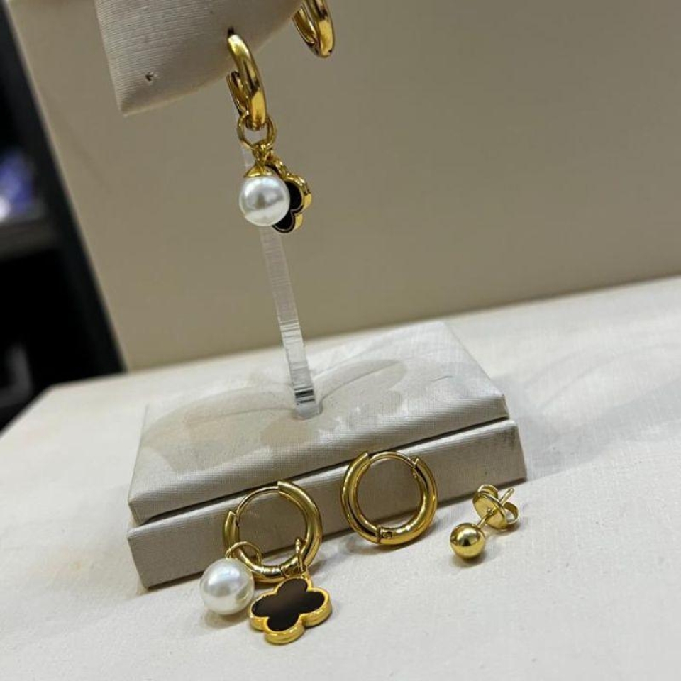 Trio de Argolas - Aço Inox Dourado nos tamanhos 10mm pingente trevo+perola/10mm liso e bolinha de 3mm.